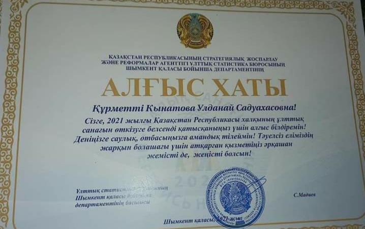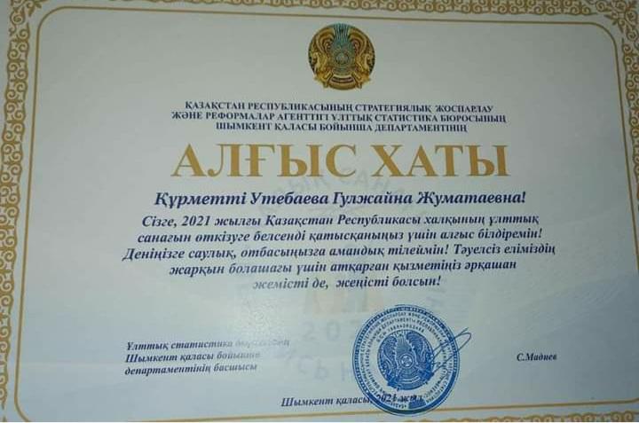 «№97 жалпы орта білім беретінмектебі» КММ » Біз туралы » Жетістіктеріміз » N97 жалпы орта білім беретін мектебі коммуналдық мемлекеттік мекемесінің ұстаздары 2021 жылдың Қазақстан Республикасының халқының ұлттық санағын өткізуге белсен қатысқаны үшін алғыс хатымен марапатталды.