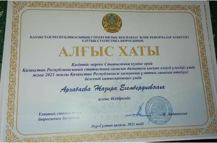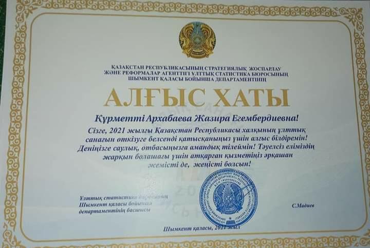 N97 жалпы орта білім беретін мектебі коммуналдық мемлекеттік мекемесінің ұстаздары 2021 жылдың Қазақстан Республикасының халқының ұлттық санағын өткізуге белсен қатысқаны үшін алғыс хатымен марапатталды.